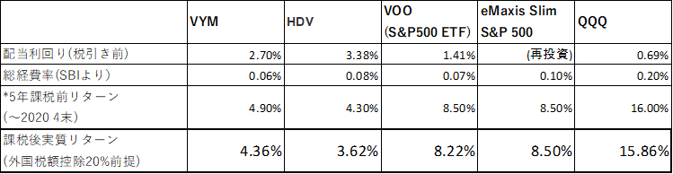 (VYM,HDV,VOO,eMaxis Slim S&P500,QQQ)